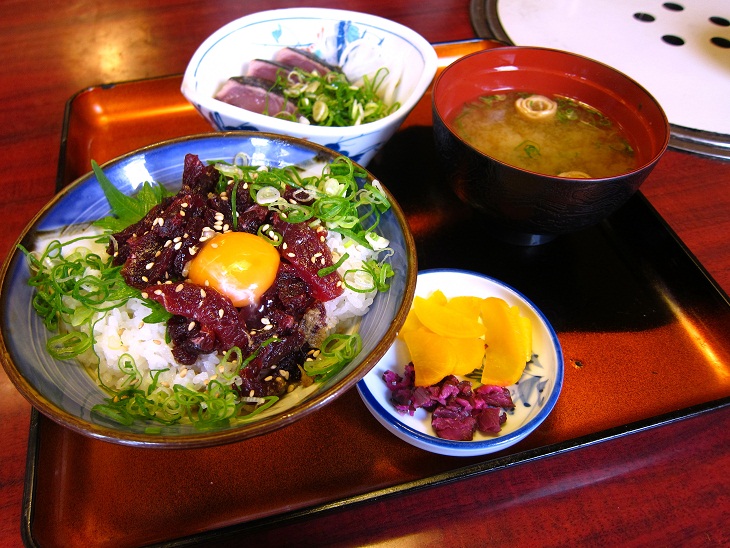 鯨ユッケ丼にカツオのタタキが付いてきます。