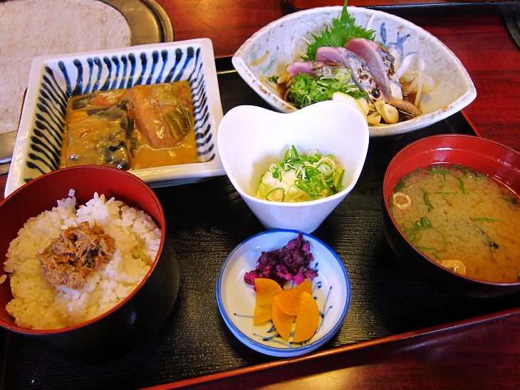 カツオのタタキ、サバの味噌煮、冷奴の定食です。ごはんの上にはカツオのしぐれ煮のようなのが載ってました。