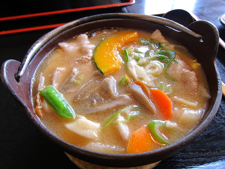 ほうとうは熱々の鉄鍋の中は具沢山の野菜と肉に平打ちのうどんです。茹でた麺をいれるのではなく、野菜が柔らかくなったところに生麺を入れて煮込むのが特徴です。
