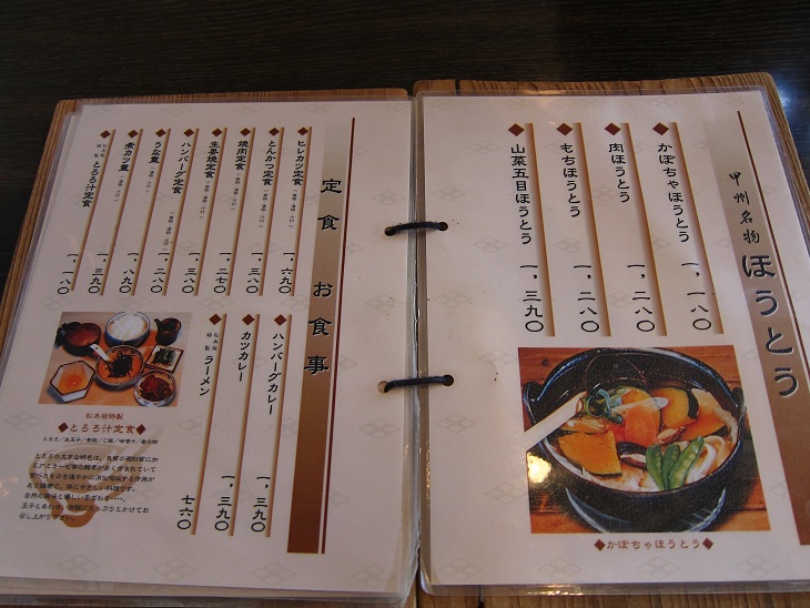 メニューのトップは勿論ほうとう、他に定食、一品料理にはもつ煮、馬刺しがあります。馬刺しも甲州の名物です。