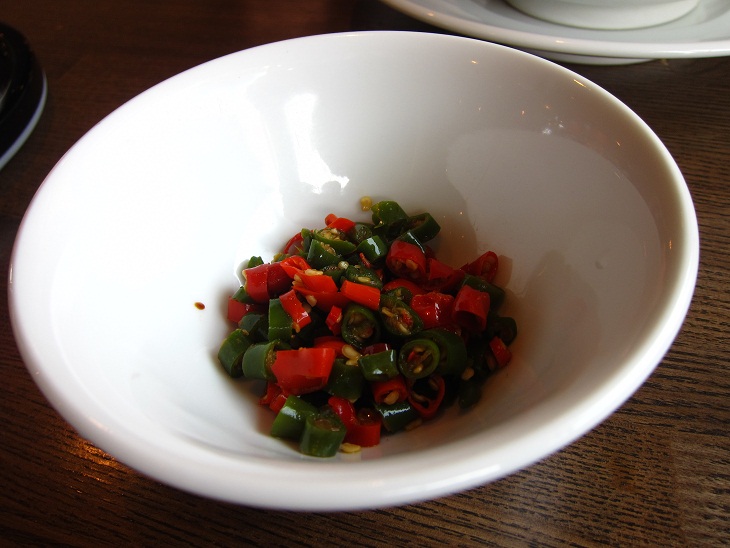 中華ソバに激辛唐辛子をトッピングしたものですが、この唐辛子がタイ産の生の唐辛子で本当に激辛なのですよ。なので調整できるように別皿にでお願いしてました。