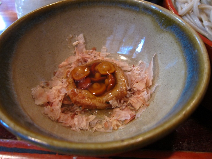 真田の甲冑と同じ赤のセイロに山になった蕎麦がやってきました。蕎麦猪口には鰹節を散りばめ味噌で作った器の中にナメコで六文銭を模ってあります。これに出汁を足して味噌汁のようにし、お好みの量の蕎麦つゆで調整したら、蕎麦つゆの完成です。