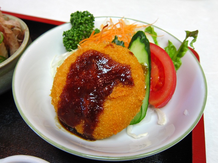 にぎり寿し、コロッケ、冷奴、小鉢、赤だし、お味もそこそこで価格の割りに色々付いてお得な感じのする定食です。