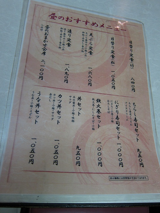 お昼のおすすめメニューには日替り定食、天ぷら定食、お寿司、丼物などありました。(ランチタイム11:30~14:30)