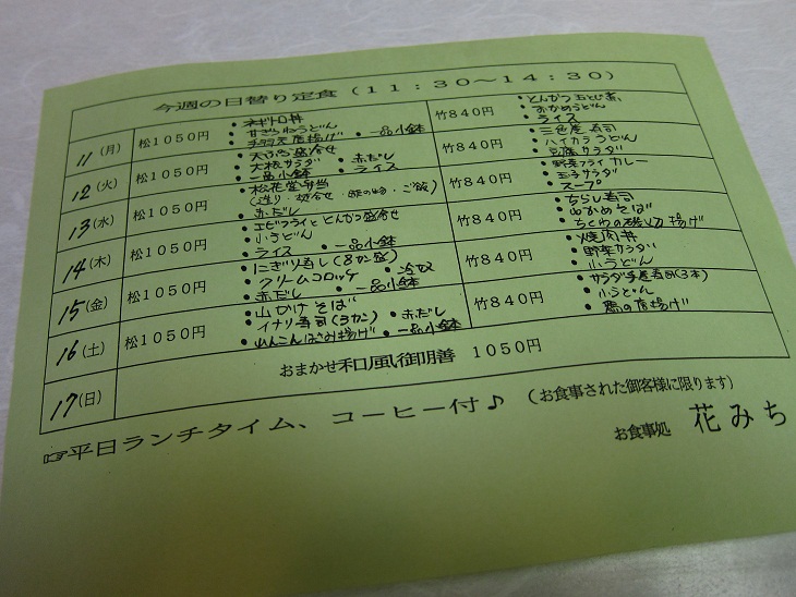 日替り定食は1週間の献立表が各テーブルにありました。毎日違う献立で近所の方は便利ですね!