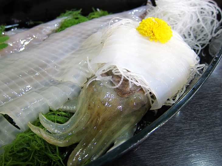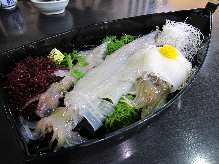 イカの活き造りは2人前で3杯のイカが載っていて甲イカとササイカでした。