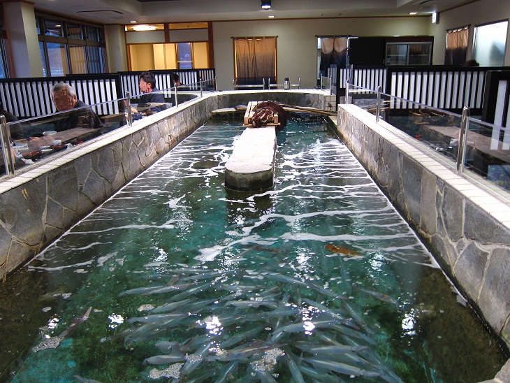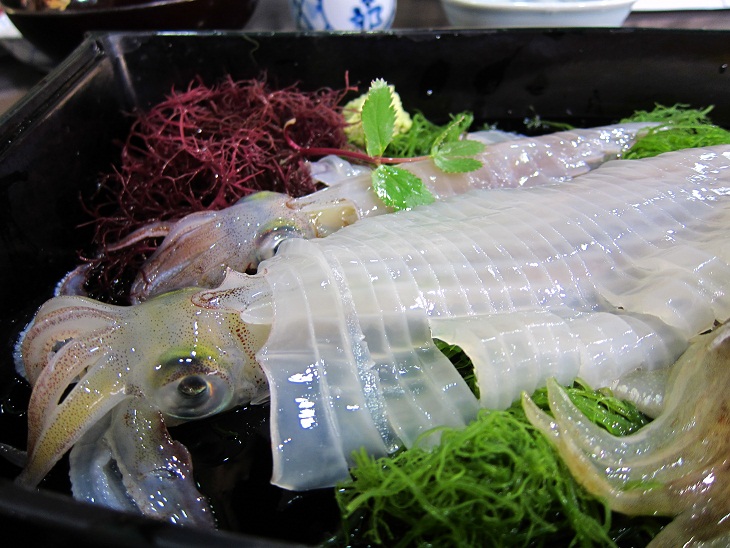 店内には生簀があり透明なイカが元気良く泳いでいます。それを見ながら食事ができるわけです。