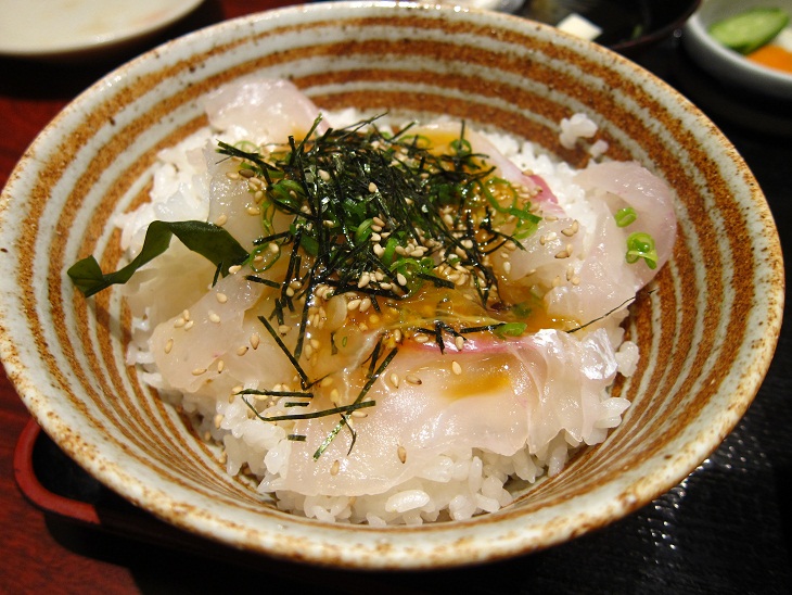 ご飯に鯛をのせて卵黄を溶いたタレ、薬味をかけて頂きます。
