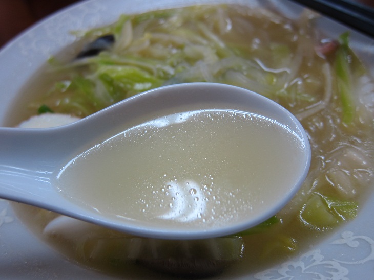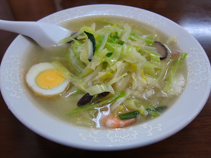 塩味の鶏ガラスープに野菜と魚介、揚げ玉子が載ります。