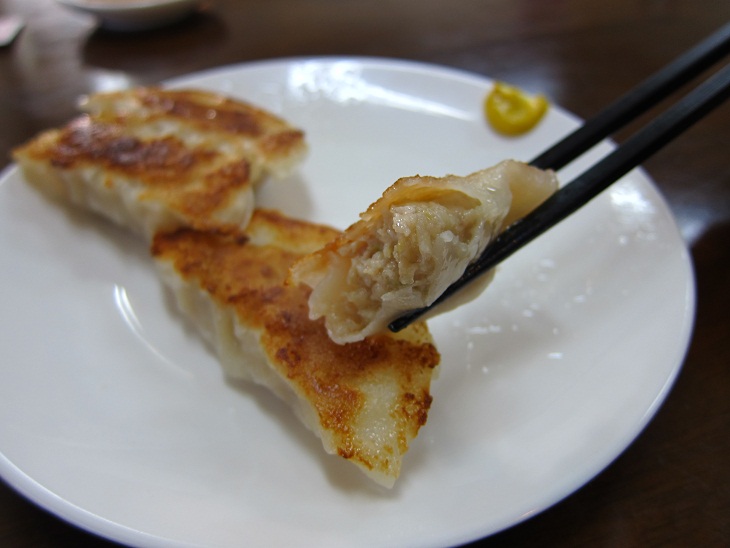 パリパリに焼かれた小ぶりの餃子です。餡はとってもジューシーで、餡に味がついているので、出してくれるタレは酢と醤油の割合が8:2のようです。肉汁の多い餃子には酸味の多いサッパリしたタレがよく合いますね。