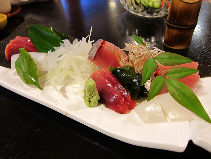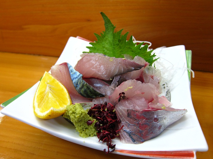 豊後サバ・豊後アジはないとのことでコチラになりました。天然ブリ、カツオ、イカの3点盛りです。