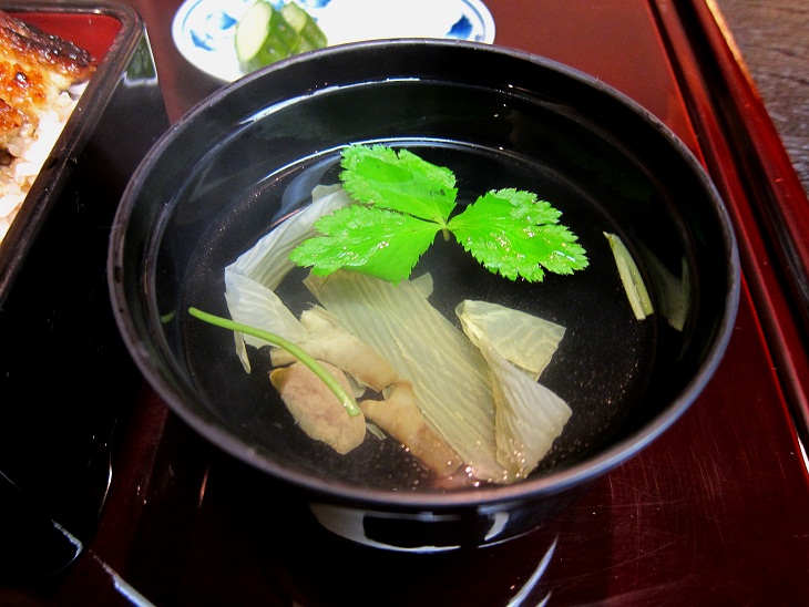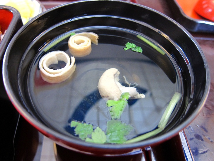 麩と三つ葉、香りに柚子が入ります。味はかなり薄味でタレが濃い分の口直しになります。