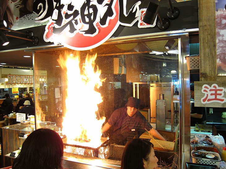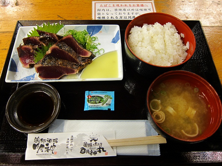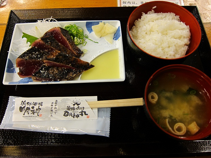 明神丸は高知城のすぐ近くにある『ひろめ市場』の中にあります。フードコートのような感じで相席は当たり前ですがガラスのブースの中では捌きたてのカツオが豪快に藁で焼かれているとこが見れます。