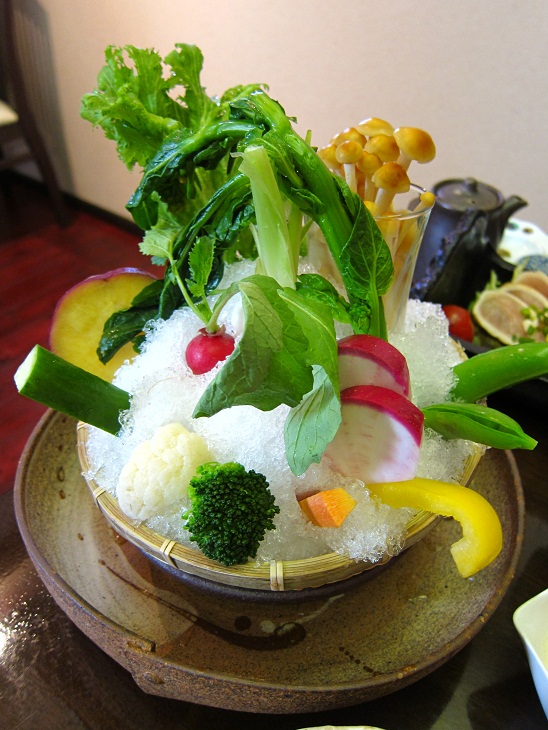 季節によって野菜が違うので盛り方も季節物でしょうか?カキ氷の山に野菜が刺さってました。見た感じ野菜のパフェですね(笑)