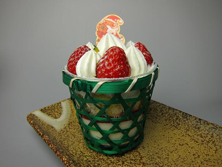 ババロア、スポンジ、クリームの層の上にイチゴがのったお菓子です。緑のカゴに入って色合い的にクリスマスのイメージですね。