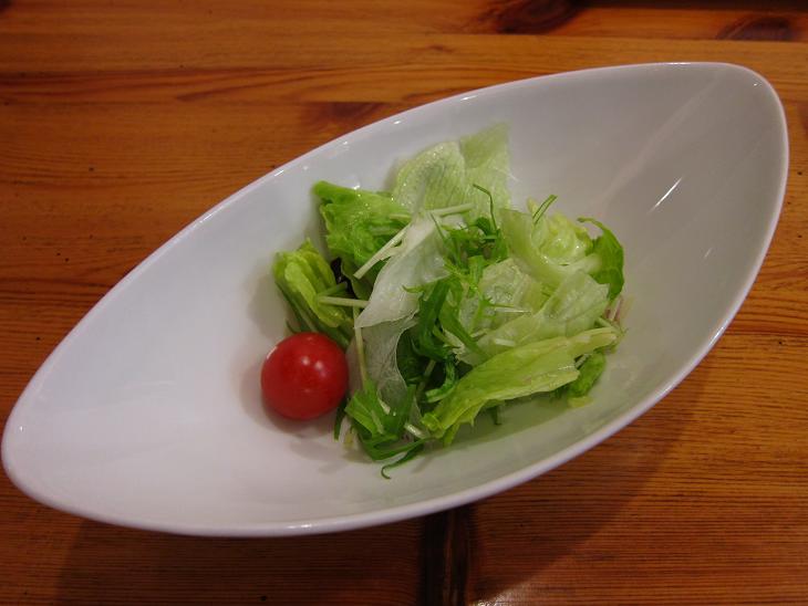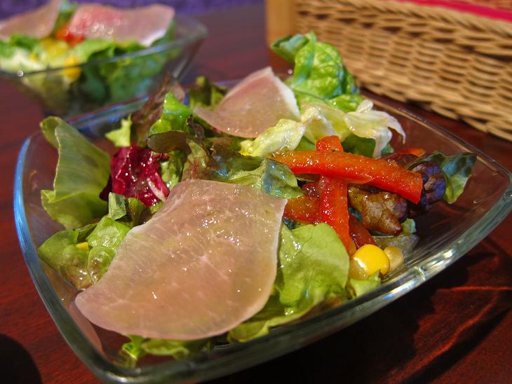 レタス、トマト、水菜、大根などのサラダです。ドレッシングは和風とフレンチでした。どちらも油が少なめで美味しいドレシングでした。あまりかけ過ぎな方が野菜の味が楽しめます。