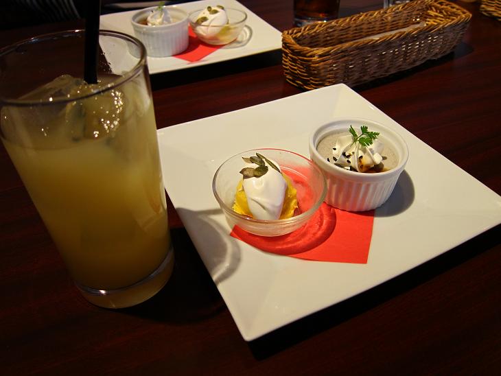 ドリンクはグレープフルーツジュースをチョイス。デザートはカボチャのアイスと胡麻プリンでした。