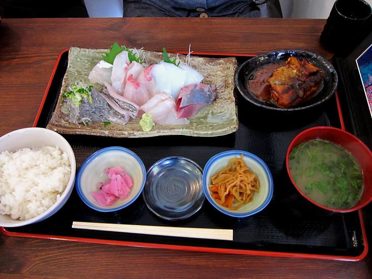 カンパチ煮付、地魚フライ、生シラス・スズキ刺の定食です。