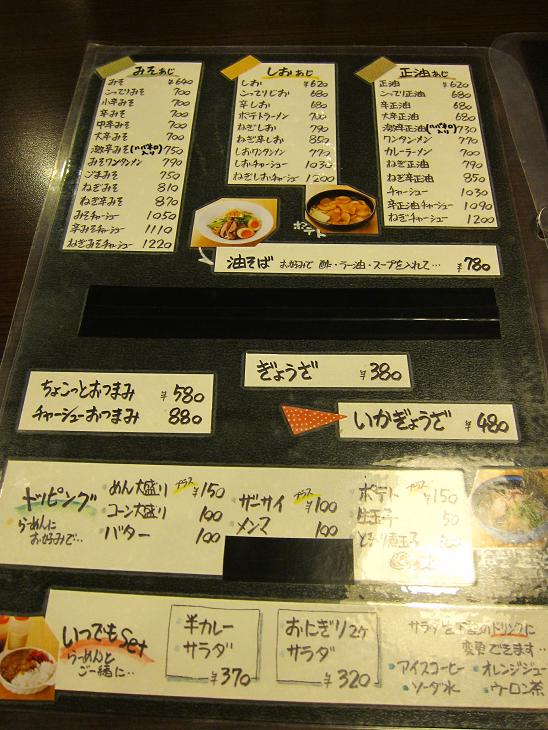 大きく分けて塩あじ、正油あじ、味噌あじで、それぞれコッテリと辛いのがあります。あと油そばもありました。
