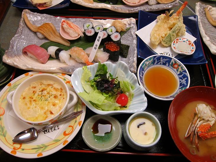 にぎり寿司、天ぷら、カニグラタン、サラダ、茶碗蒸し、味噌汁の御膳です。
