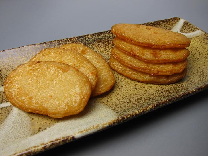 手作り無添加の小判型のさつまあげです。練ったグチとタラの身を植物油で揚げています。赤いものが見え隠れしていますがニンジンのようです。