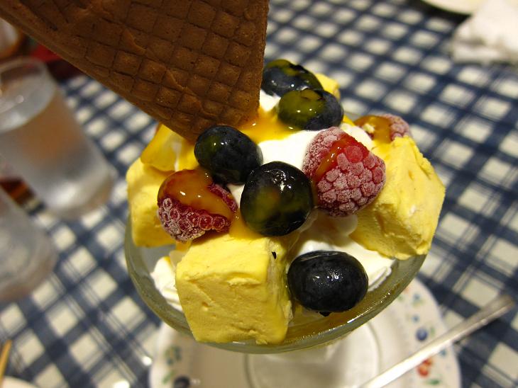 アイスクリームとレアチーズにマンゴーソースがかかって、超大粒ブルーベリーがたくさん入ってます。