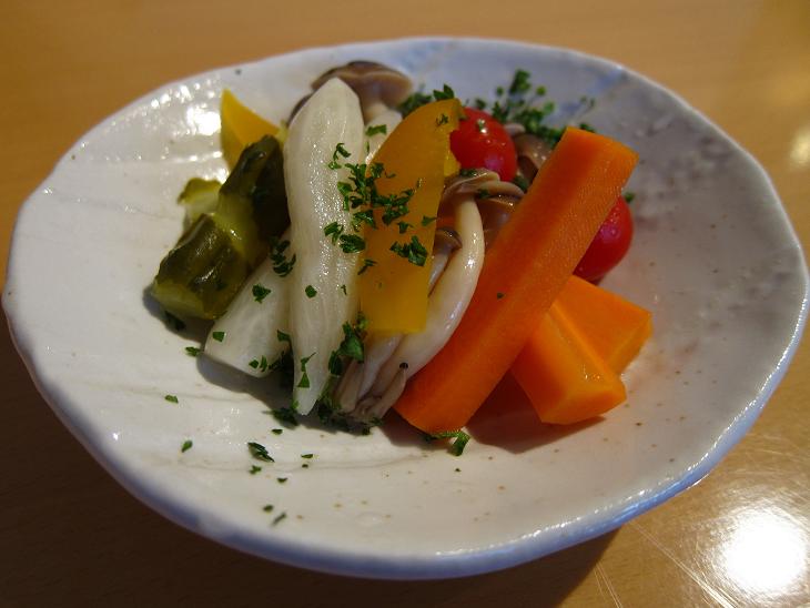 旬の野菜を使ったピクルスということでよいでしょう。とても彩りが良いです。やさしい酸味と好みの甘味でお気に入りの味でした!