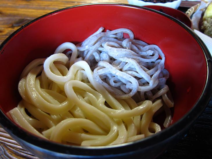 まずは白く太い方の『百合うどん』は百合根が入ったうどんです。少しボソッとしていますが力強いうどんです。