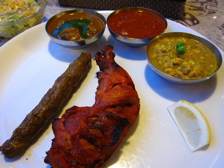 タンドリーチキンとシークカバブ、カレー3品、ナンorライス、サラダ、ドリンクのセットです。