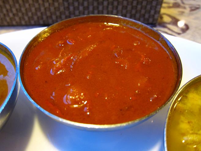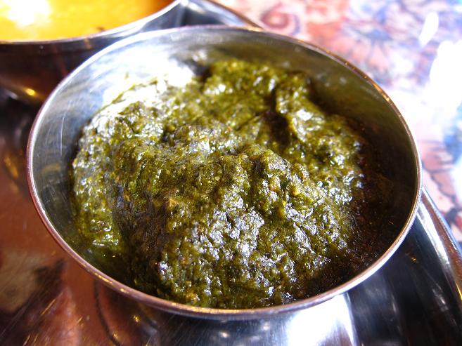 マトンのカレーです。緑のソースはホウレン草ソースです。一番スパイシーで辛さもありました。