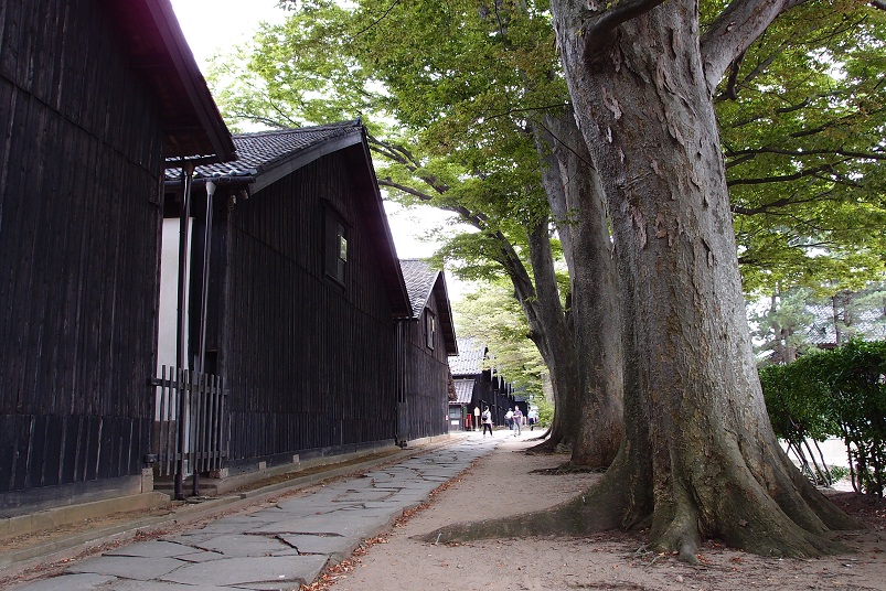 黒い三角屋根が連なる倉庫とケヤキ並木。